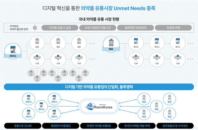 의약분업과 복제약 활성화 정책 등으로 인해 의약품 유통사가 급증하였으며, 이에 따라 유통구조 역시 복잡해진 것이 의약품 유통시장의 현실인데요. 이러한 부분을 이커머스를 통해 해결하는 것입니다.