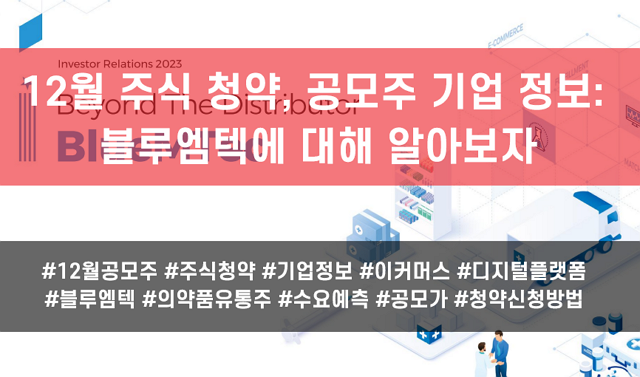 12월 4일, 5일 양일간 주식 청약이 진행되는 블루엠텍에 대해 알아보겠습니다. 블루엠텍은 의약품 유통시장의 디지털 혁신을 선도하는 기업이라고 소개하고 있습니다. 회사 정보에 앞서 블루엠텍의 청약일정과 수요예측 경쟁률, 공모가 등을 먼저 알아보고 기업의 현재와 추구하는 방향에 대해 알아보겠습니다.